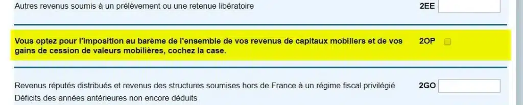 - Lors du remplissage de votre déclaration de revenus (formulaire n°2042), vous devez cocher la case 2OP pour signifier votre choix d'imposition au barème progressif.