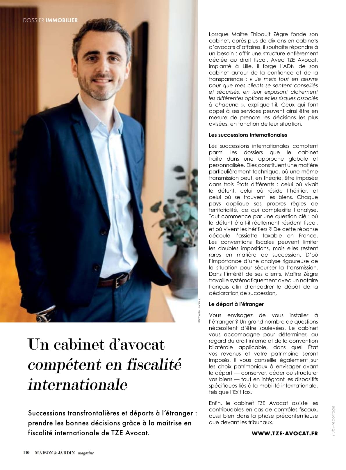Le cabinet TZE Avocat a récemment été mis à l’honneur dans le magazine national Maison & Jardin (n°169 – janvier/février 2026), qui consacre un article à son intervention en fiscalité internationale, et notamment en matière de successions transfrontalières et départs à l’étranger.