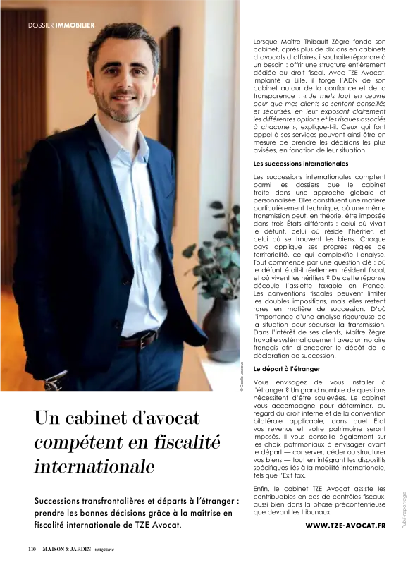 Le cabinet TZE Avocat a le plaisir de figurer dans le dernier numéro du magazine Maison & Jardin, pour son accompagnement en fiscalité internationale, successions internationales et expatriation